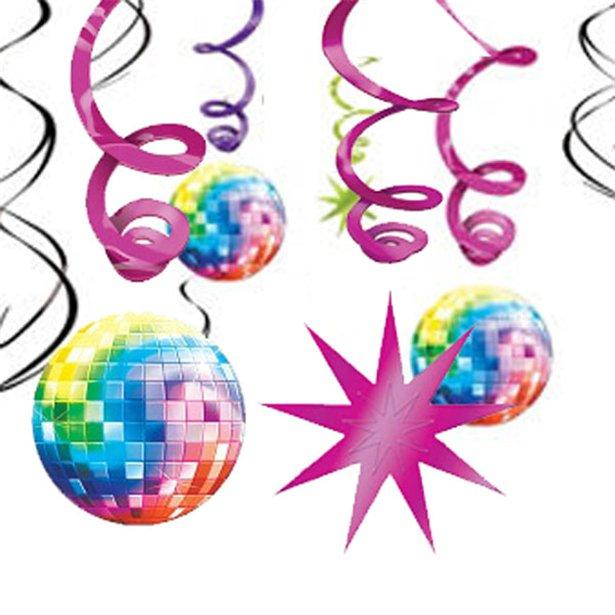 Flotte swirls til diskofesten til loftet, baren eller dansegulvet.Pakken indeholder 12 swirls – 3 med diskokugler, 3 med stjerner og 6 uden dekoration.Super flot og festligt pynt til den ultimative diskofest. (Læs mere)
