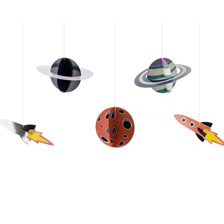 5 flotte loftdekorationer til fødselsdagen i det ydre rum.Dekorationerne forestiller planeter og rumraketter.Hæng dem over bordet eller i vinduet for den perfekte stemning til fødselsdagen med rum tema.Snor medfølger. (Læs mere)