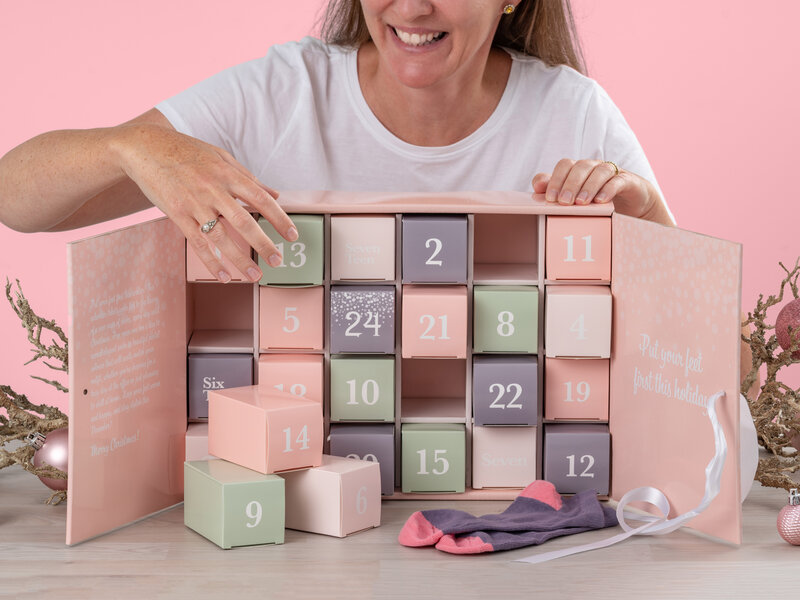 Giv fødderne lidt ekstra kærlighed og omsorg til jul. Vores julekalender med stilrene og pastelfarvede strømper kvikker trætte fødder op hver dag frem til juleaften! Indeholder 24 par strømper i størrelse 37-40. (Læs mere)